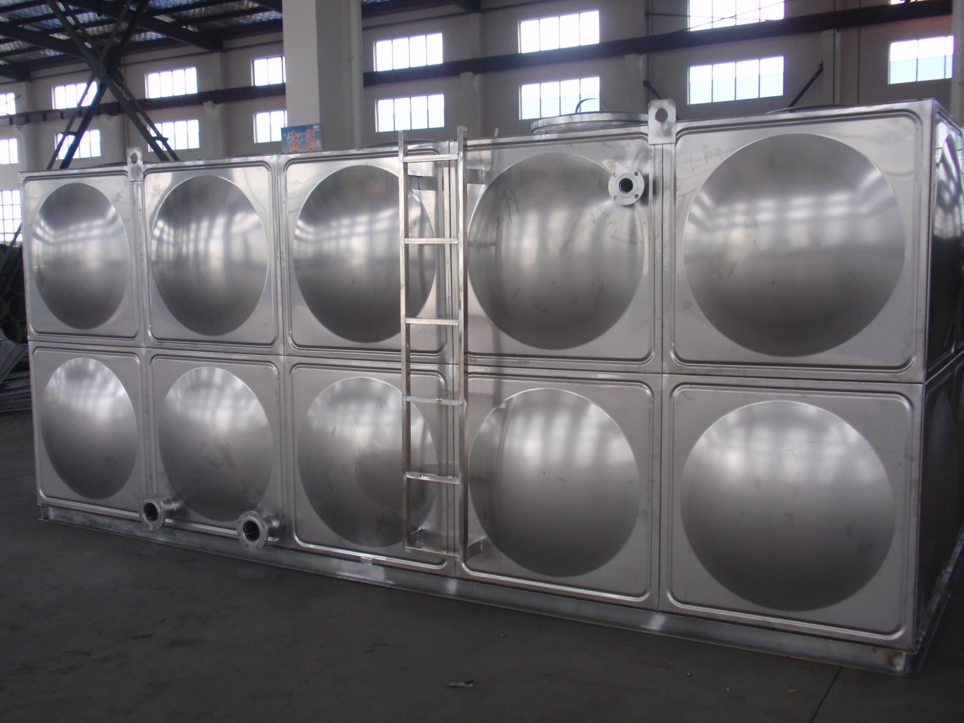 不銹鋼水箱多為方形組合式水箱。采用SUS304、SUS316L 、SUS444等不銹鋼板,沖壓成型。 一般沖壓成三種尺寸,分別是1x1米、1x0.5米和0.5x0.5米三種,周邊用鎢極氬弧焊接,具有強度高、重量輕、成本低、環保衛生等特點。制造標準為國家建筑標準12s101設計圖集。